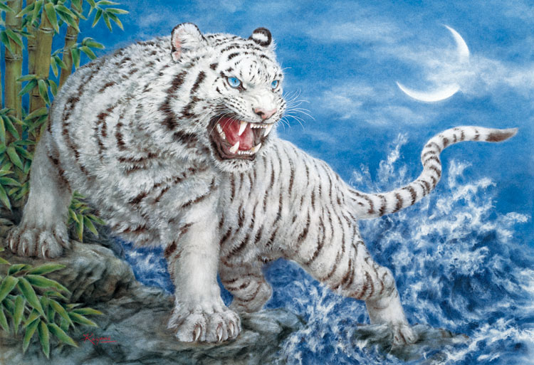 これも原井氏の絵柄パズルとなっていますが、この白い虎もおめでたい生き物として正月パズルに十分だと思いますが、繊細な感じと力強い感じの混ざり具合が絶妙で不思議な躍動感のある絵柄だと思います。 鷹の絵柄を対にして並べると対決感が半端なくなりそうです。