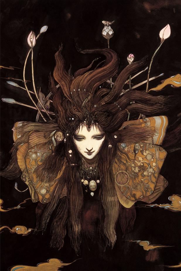 これもファンタジーの王道的な「暗闇に浮かぶ上半身」的な絵ではあるのですが、凄いのは細かな装飾ですね。