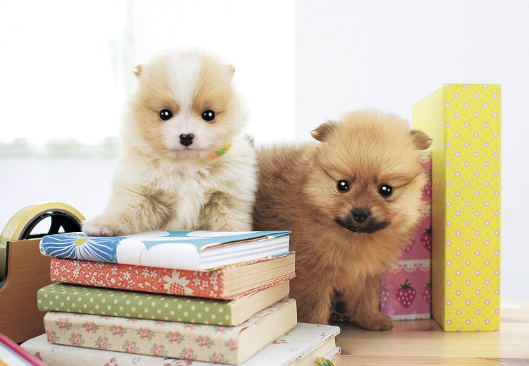 ぬいぐるみのように可愛い子犬が本の世界から飛び出して来た風にも見える不思議な情景になっていますうね。ワンちゃんにとっては本もテープも触って隠れて楽しい遊び道具といった所でしょうか。