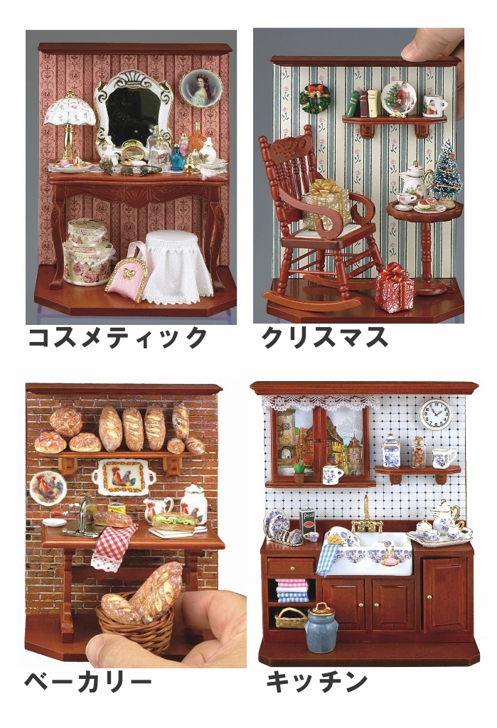 種類もこのような住宅室内のものから、上のフラワーショップのような街のお店などを舞台にしたものも多く、飾り方で色々テーマを決めた世界を楽しむことが出来そうです。