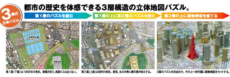 パズルの一層目に過去を映し出すような歴史的な地図、二層目には現代の地図、そしてその上に主な建築物の立体模型をセットすることで、非常に奥深さと楽しさが詰まった立体パズルが完成するという仕組みになっていて、地図としても非常に魅力的ですね。