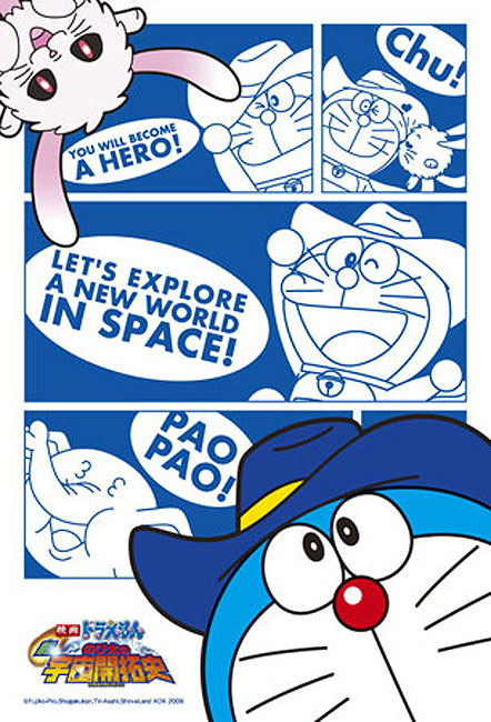 これは2009年度版の映画「のび太の宇宙開拓史」に関するパズルだと思います。英語でかかれているので自分には全く何のことだか分からないのですが、象が「パオパオ!」等と吠えているのだけは理解できます。 あとはウサギの様なキャラクターがドラえもんの耳元で「シーエイチユー!」等と叫んでいるコマも気になる処です。