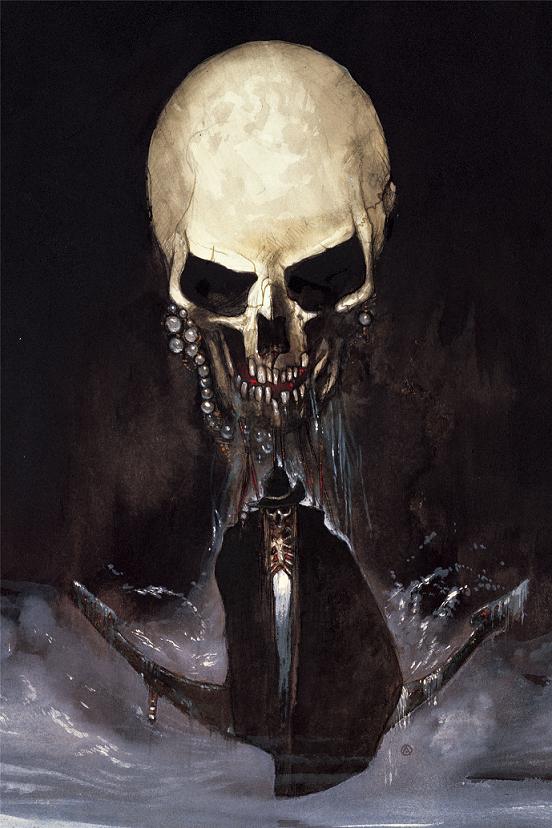 これもファンタジーの王道的な「暗闇に浮かぶ上半身」的な絵ではあるのですが、凄いのは細かな装飾ですね。