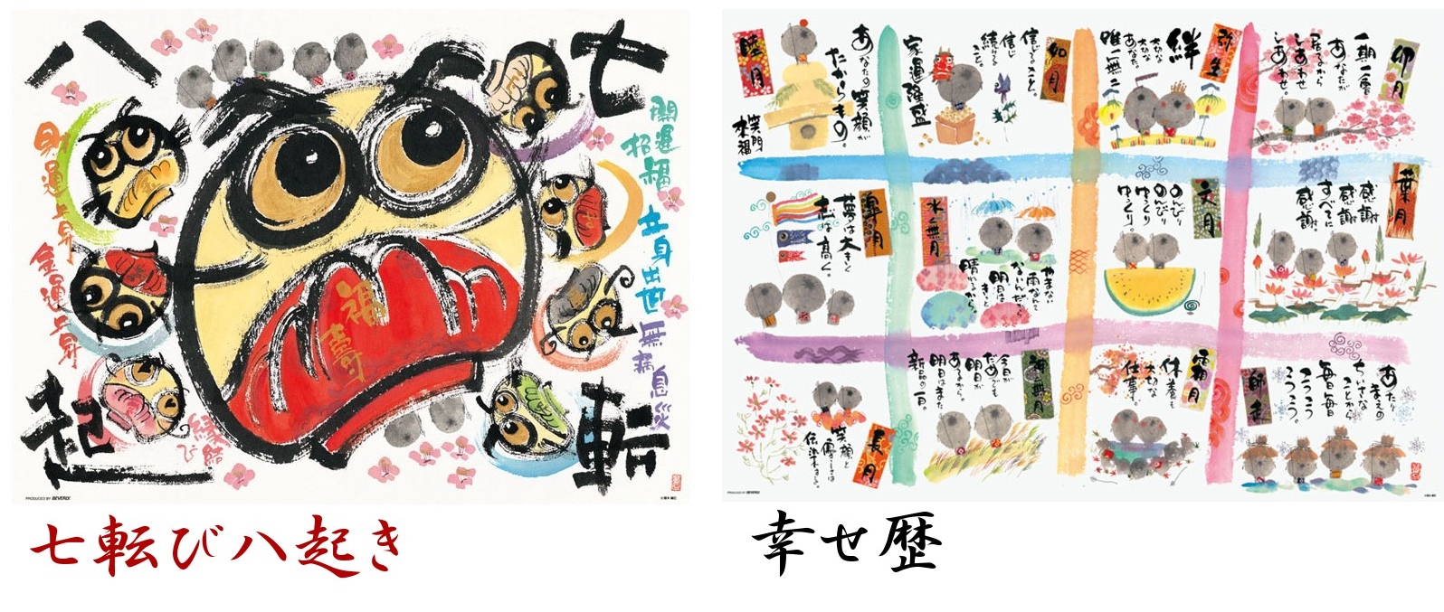 これらも「御木」氏の絵柄パズルで、どちらも作り甲斐のあるパズルとなっていると思います。七転び八起きの絵柄を飾って去年転んだ分余計今年起き上れるように頑張ってみるのもいいですし、幸せ歴のように一年中飾っていられる暦調のイラストパズルも非常に楽しそうです。