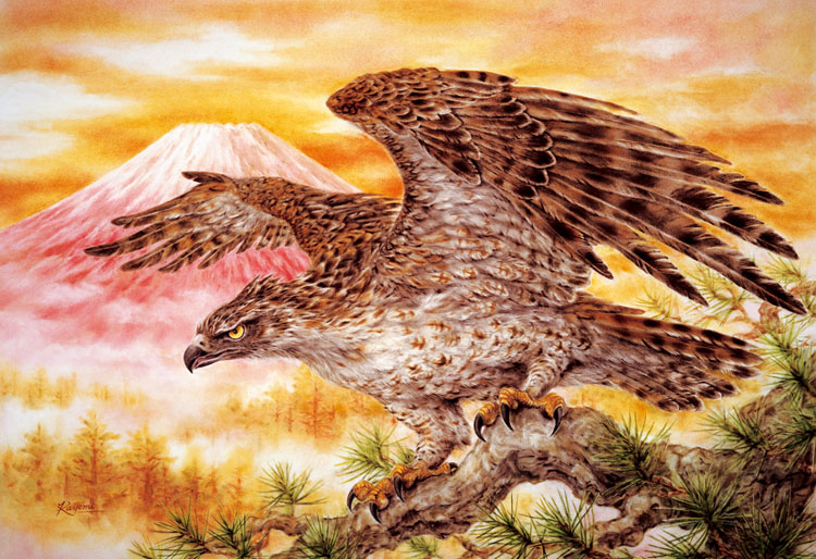 これも原井氏の絵柄パズルとなっていますが、この白い虎もおめでたい生き物として正月パズルに十分だと思いますが、繊細な感じと力強い感じの混ざり具合が絶妙で不思議な躍動感のある絵柄だと思います。 鷹の絵柄を対にして並べると対決感が半端なくなりそうです。