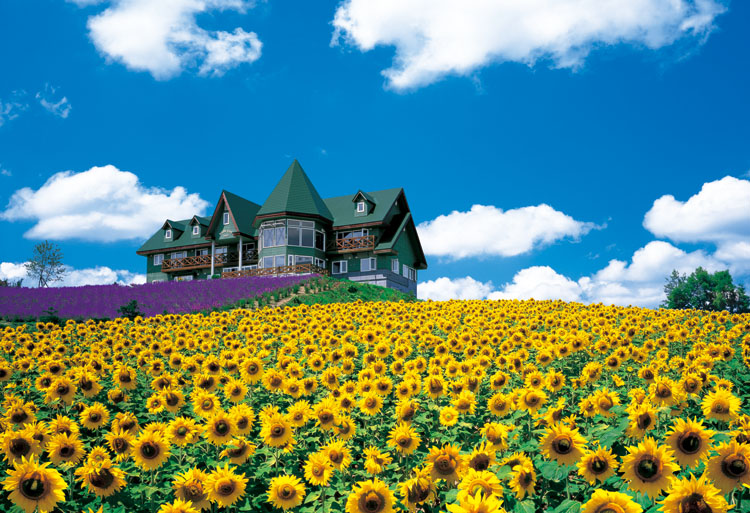 上のパズルが今回最初に目についた「ひまわり」が咲き乱れている鮮やかな絵柄のパズルで、ドラえもんの様に青い空とドラミちゃんの様に黄色い花。