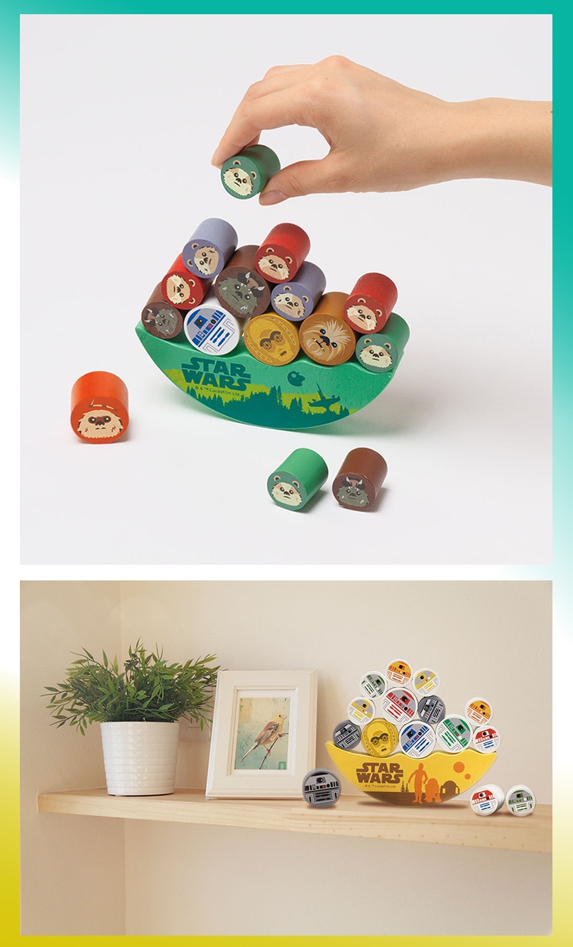 上のパズルが今回最初に紹介させていただく【スターウォーズ】絵柄版の「バランスパズル」なのですが、ゲームとしてのルールは簡単で、グラグラ台座の上に円柱系のピースを「崩さない様に全部積み上げる」という非常にシンプルなものとなっています。