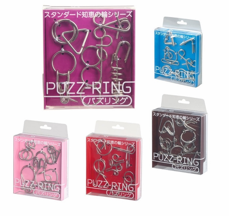色々なカラーが用意されていて、上に乗せたのは「パープル」「ブルー」「ブラウン」「レッド」「ピンク」となっていますが、その他にも「オレンジ」「イエロー」「グリーン」等様々なカラーがあって、それぞれ中身の違う知恵の輪が楽しめるということのようです。