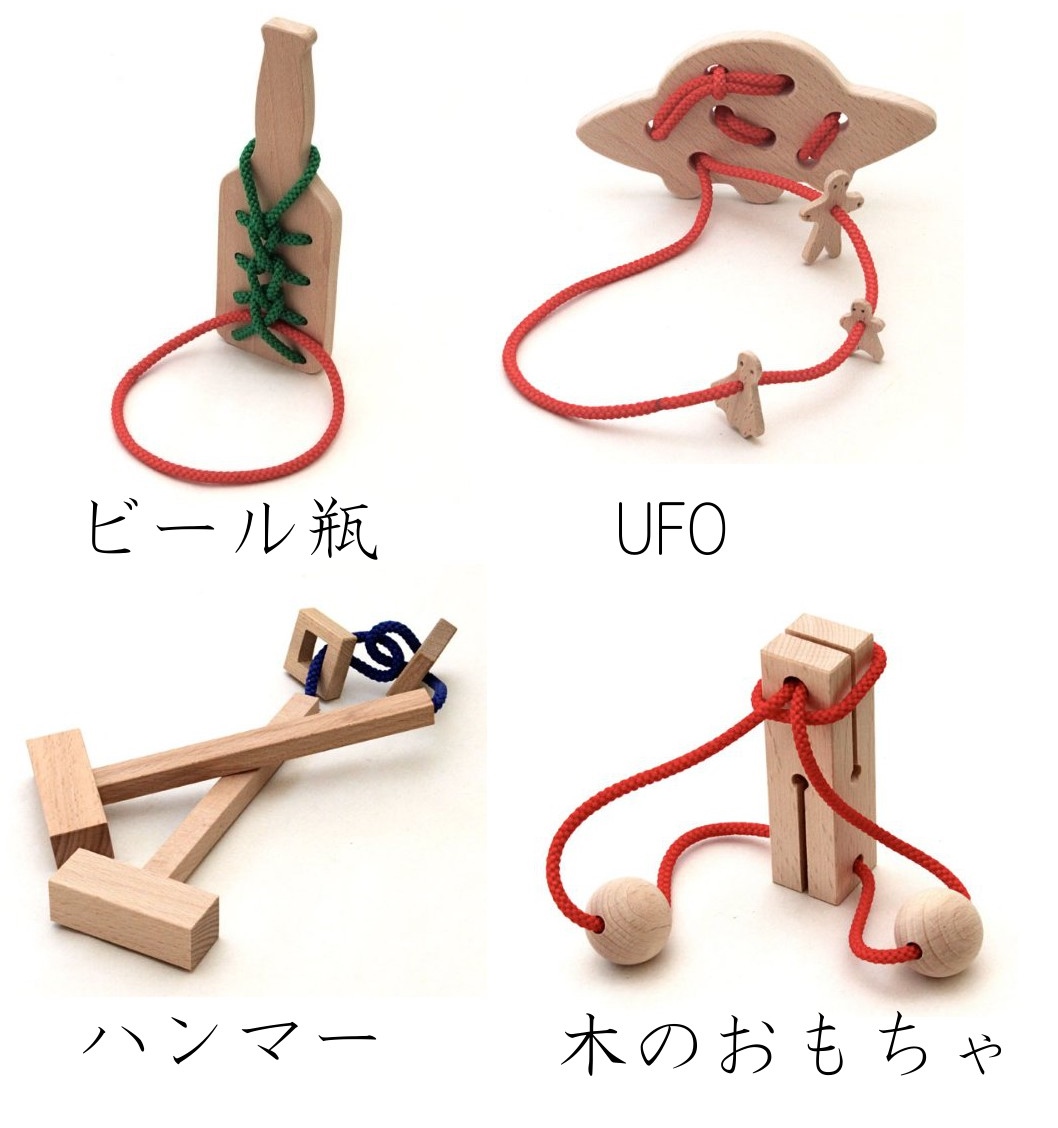 現在の所上の「ねずみとチーズ」の関連パズルとして確認が可能なものの中から掲載をさせて頂くと上の画像のような同シリーズのパズルがあるようです。 どれも紐を外すことでクリアできる内容になっているようですが、「答えが分かったら面白くないから」ということで解答などがついて来ないそうなので、チャレンジする場合はガチな戦いになりそうです。