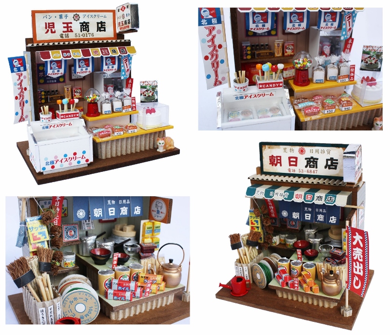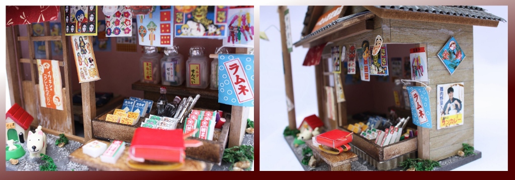 上の写真にあるのが今回最初に紹介したい「昭和シリーズ」の手作りドールハウスキットで、懐かしい雰囲気満載の【駄菓子屋】を再現することができるものとなっています。今回はテーマとしてこういった昔ながらの風情を感じる「お店」のキットについてまとめさせて頂きました。