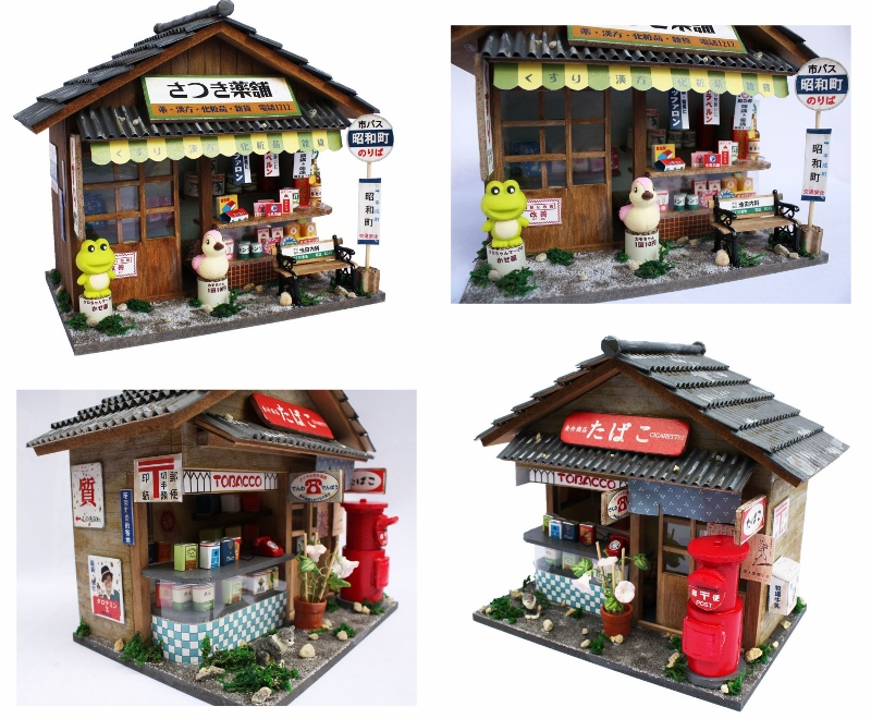上の駄菓子屋と同様のクオリティのキットが他にも色々な種類が用意されているようで、店やバス停の看板。郵便ポストや商品に至るまで本物同然のリアリティで部屋に昭和の近所のお店を制作することが可能です。複数の種類をコレクションして並べて飾るのも非常に楽しそうですし、作り甲斐がありそうです。
