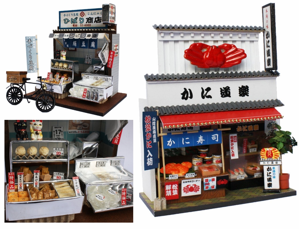 また、上の画像のような少し町の方へ移動して商店街の店並を飾るようなお店のミニチュアドールキットも色々と挑戦することもできるようです。個人商店の店先の商品やカニ料理店では定番の豪快なカニの看板など、雰囲気抜群に仕上げることができます。