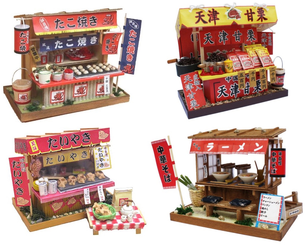 ちょっと冷える秋の日に屋台の暖かい食べ物やラーメン等で一息付くのはやめられませんね。見ているとついつい本物のたこ焼きやたい焼きを食べたくなってしまいます。屋台に商店に老舗にと揃えたらかなり情緒感が半端じゃない「レトロ街道」を作ることができそうです。