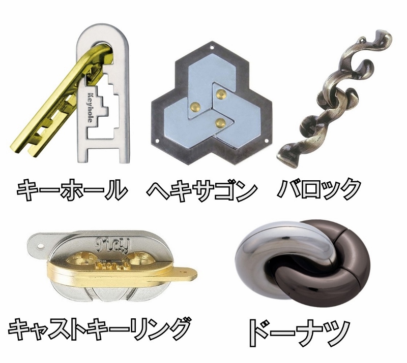 これらはうって変ってアクセサリーのような美しさを放っているキャストパズルで、ハートやリングを形とったキュートなモチーフのものもあったり女性にも完成を楽しみに取り組めるデザイン性を意識しているのもうかがえます。下の段の魚や海の生き物をテーマにしたものはこれからの暑いシーズンに挑戦することに旬を感じることが出来そうです。